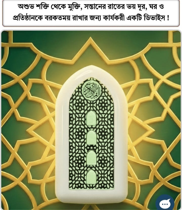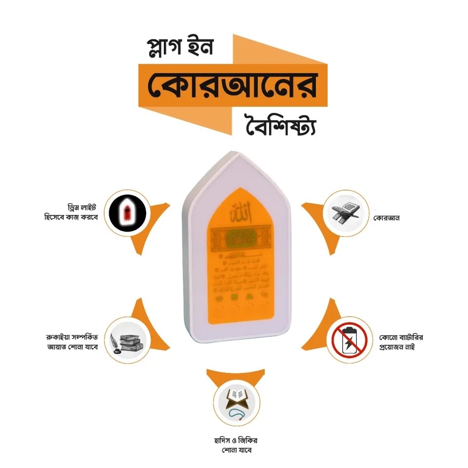 কোনো ঘরে যদি নিয়মিত কোরআন তেলাওয়াত করা হয়, তাহলে সেই ঘরে মহান আল্লাহ বারাকাহ দান করেন। এটি এমন একটি ডিভাইস যেটি ইলেকট্রিক সকেটের সাথে প্লাগ করলেই কুরআন তেলাওয়াত শুরু করবে এবং ড্রিম লাইট হিসেবেও ব্যবহার করা যাবে।১ বছরও যদি প্লাগ থেকে খোলা না হয় ১ বছর পর্যন্ত কোরআন তেলাওয়াত চলতেই থাকবে। রাতে ঘুমানোর সময় তেলাওয়াতের সাউন্ড কম/বেশি এডজাস্ট করে তেলাওয়াত ছেড়ে এবং ড্রিম লাইটের আলো কম/বেশি এডজাস্ট করে ঘুমিয়ে পড়ুন। এই কুরআন তেলাওয়াত সকল অদৃশ্য/অশুভ শক্তি থেকে আপনার ঘরকে সারারাত পাহারা দেবে ইনশাল্লাহ। ঘুম থেকে উঠে আনপ্লাগ করুন।