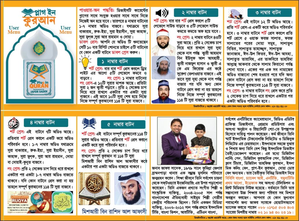 কোনো ঘরে যদি নিয়মিত কোরআন তেলাওয়াত করা হয়, তাহলে সেই ঘরে মহান আল্লাহ বারাকাহ দান করেন। এটি এমন একটি ডিভাইস যেটি ইলেকট্রিক সকেটের সাথে প্লাগ করলেই কুরআন তেলাওয়াত শুরু করবে এবং ড্রিম লাইট হিসেবেও ব্যবহার করা যাবে।১ বছরও যদি প্লাগ থেকে খোলা না হয় ১ বছর পর্যন্ত কোরআন তেলাওয়াত চলতেই থাকবে। রাতে ঘুমানোর সময় তেলাওয়াতের সাউন্ড কম/বেশি এডজাস্ট করে তেলাওয়াত ছেড়ে এবং ড্রিম লাইটের আলো কম/বেশি এডজাস্ট করে ঘুমিয়ে পড়ুন। এই কুরআন তেলাওয়াত সকল অদৃশ্য/অশুভ শক্তি থেকে আপনার ঘরকে সারারাত পাহারা দেবে ইনশাল্লাহ। ঘুম থেকে উঠে আনপ্লাগ করুন।
